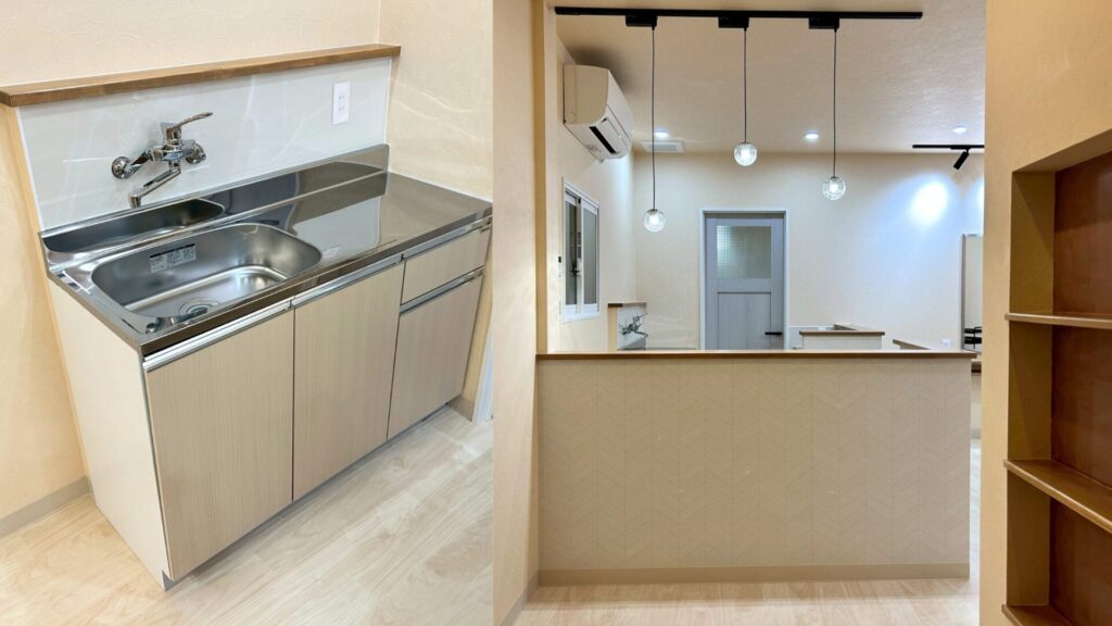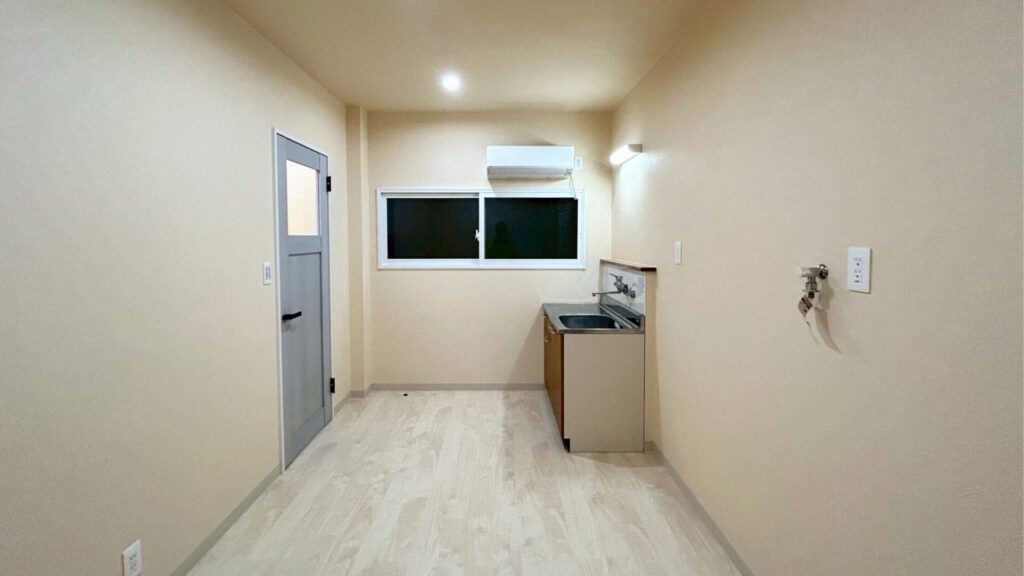丹波市黒井のアパートで、2部屋を仕切っていた壁を取り払い、 もともと別々だった空間をひとつにつなげる改修工事を行いました。