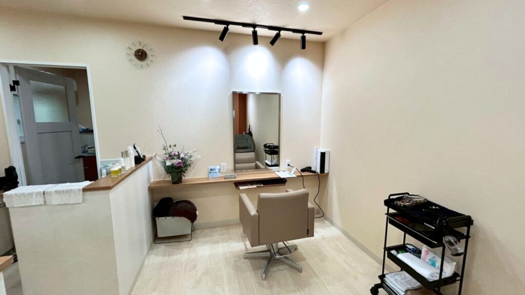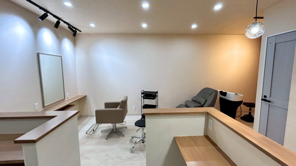オーナー様のイメージを丁寧に伺いながら、明るさ・動線・素材感のバランスを大切にしたサロンに仕上がりました。セット面の落ち着いた照明、温かみのある木の質感、清潔感のあるバックヤード、柔らかな色味の受付スペース、そして外観のやさしい佇まい。店舗全体がひとつの世界観としてまとまり、長く愛されるサロンになることを願っています。