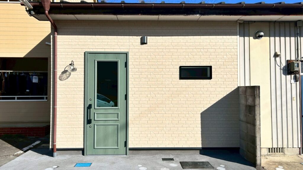 淡いベージュの外壁に深いグリーンの扉がアクセントとなり、落ち着きと上品さを感じる佇まいに仕上がりました。小窓や照明の配置にもこだわり、シンプルながら印象に残るファサードです。外壁や玄関まわりを明るい色味でまとめたことで、訪れる方をやさしく迎え入れる、あたたかい雰囲気が生まれました。