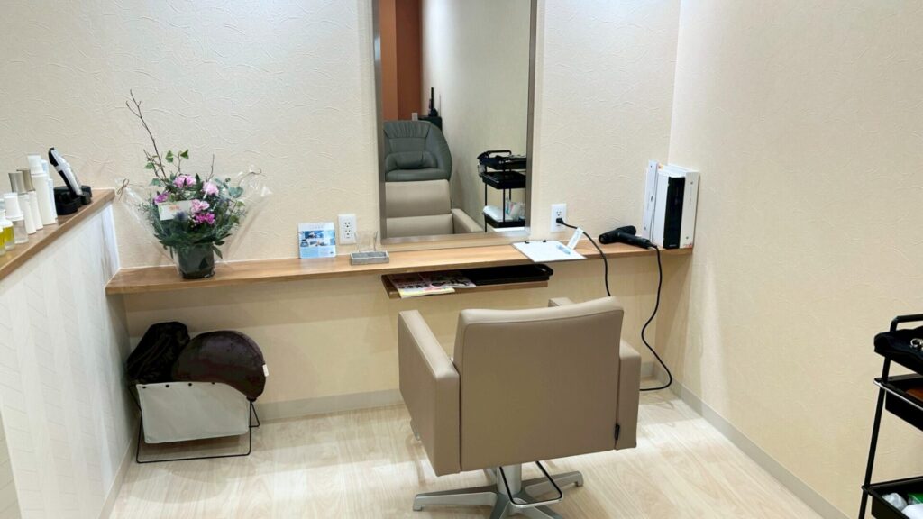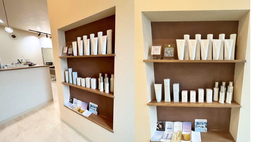 仕上げ後は、商品棚にケア用品やスタイリング剤を並べ、サロンの世界観をさらに引き立てています。 整然と並んだアイテムは、空間のアクセントとしても機能し、訪れたお客様の目を楽しませてくれます。