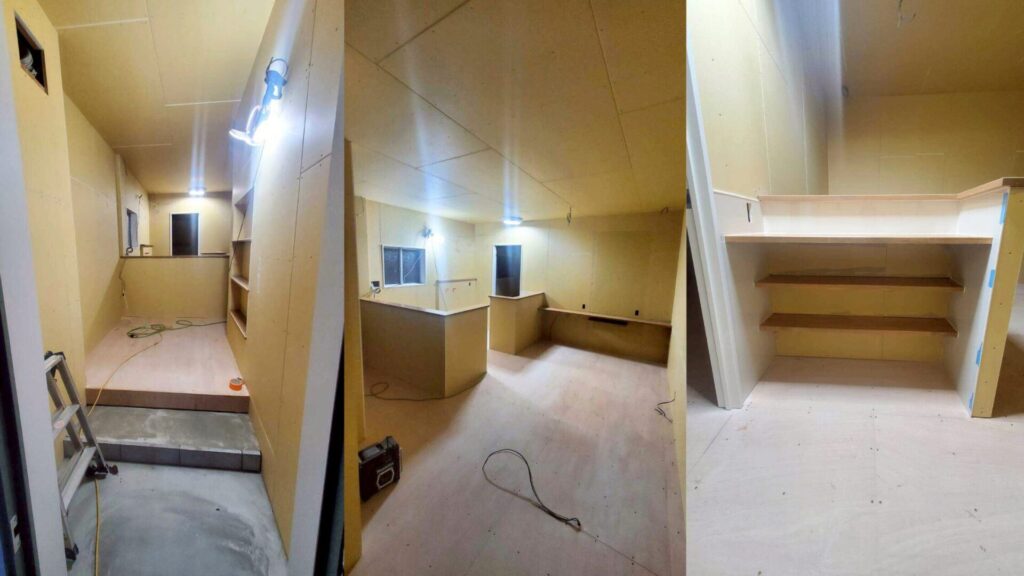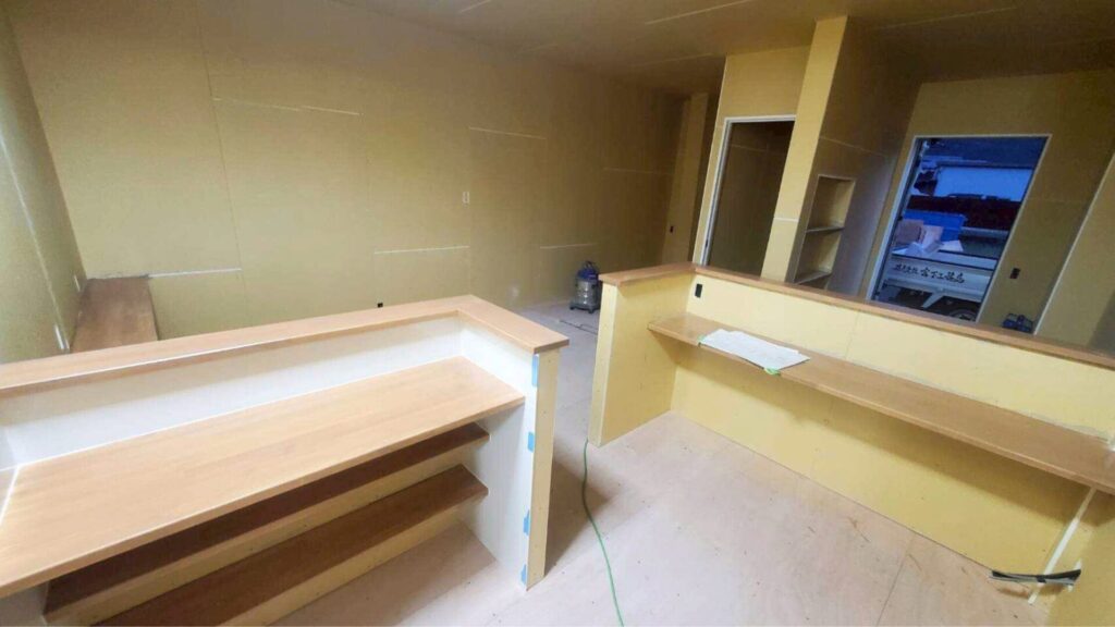 年末の慌ただしさの中でも、天井・壁・床の下地づくりから配管・配線、造作家具、バックヤードの整備、セット面や照明の仕上げまで、一つひとつ丁寧に積み重ねてきた現場です。