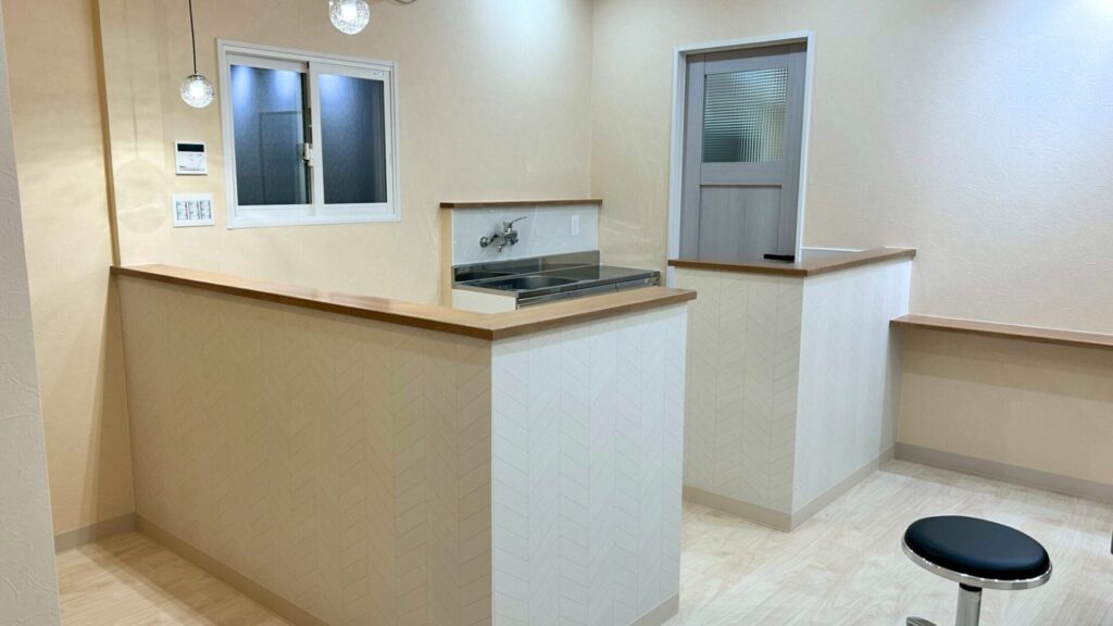 水回り・洗濯機スペース・収納など、スタッフが日々使う場所も新しく整えました。 明るく清潔感のある空間に仕上がり、働きやすさにもつながる設計です。