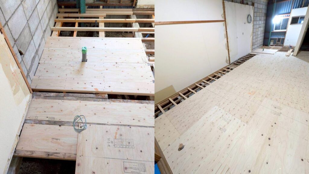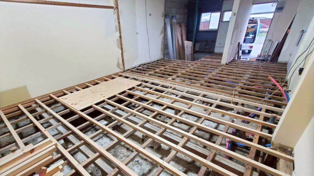床下には給排水の配管を新設し、根太を組み直して強度と安定性を確保しました。 美容室は水まわりの使用が多いため、配管の位置やメンテナンス性にも配慮しています。