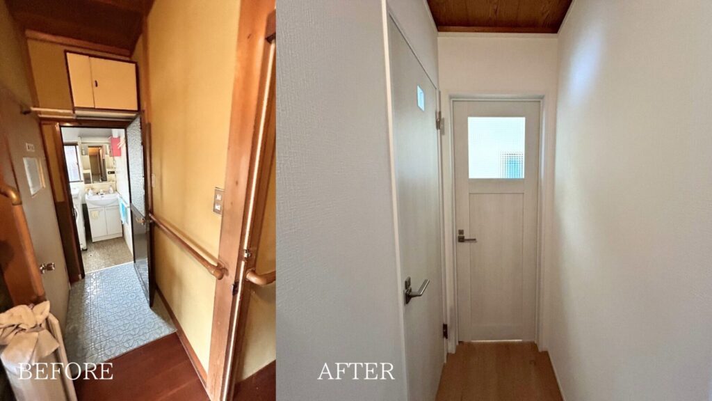 例えば写真の様に、あまり光が入らない廊下なども、明るい壁紙に張り替えることで、暮らしをやさしく整えてくれます。